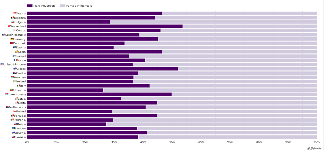 De los 30 países encuestados, 28 de ellos tienen más del 50% de influencers femeninas. De hecho, solo Suiza y Grecia tienen más influencers masculinos que femeninos, con un 53,65% y un 52,09% respectivamente.
